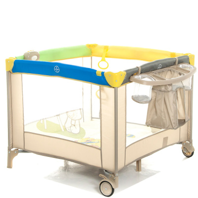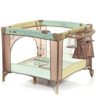 Детский манеж Noony Babyland. Комплектуется матрасом, навесной полкой-органайзером для подгузников и гигиенических принадлежностей, навесным блоком (с подсветкой, музыкой и вибрацией), хватательными кольцами для малыша, двумя колесами со стопорами (для облегчения перемещения).